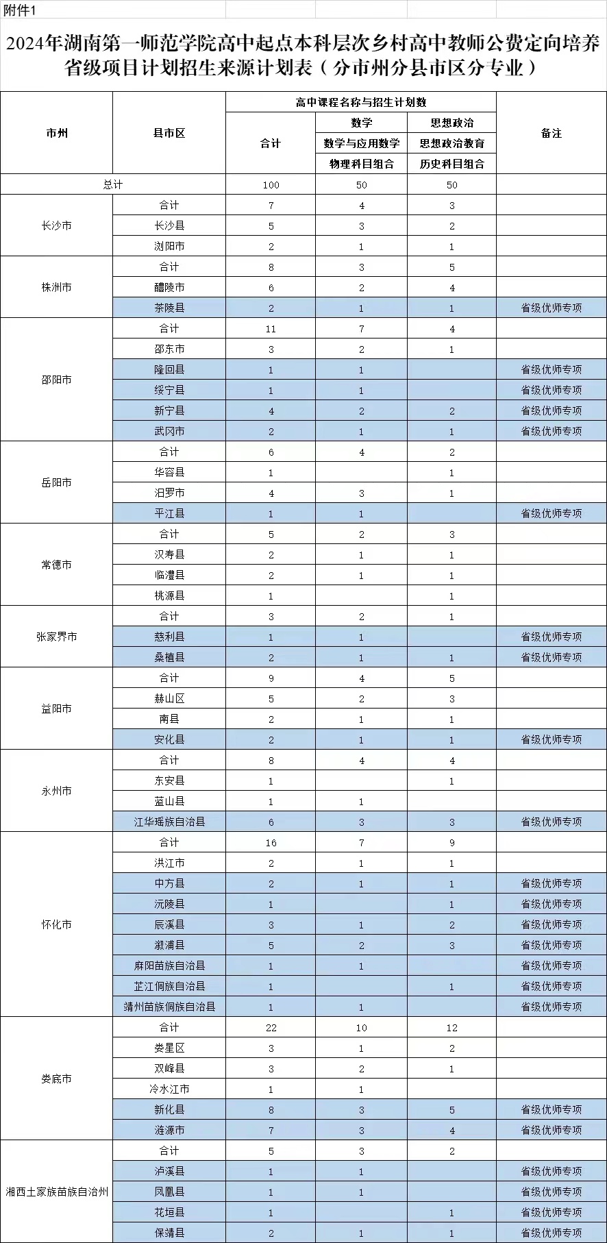 (一)本科层次高中教师公费定向培养招生计划:100人,其中省级优师专项56人。(详见附件1)