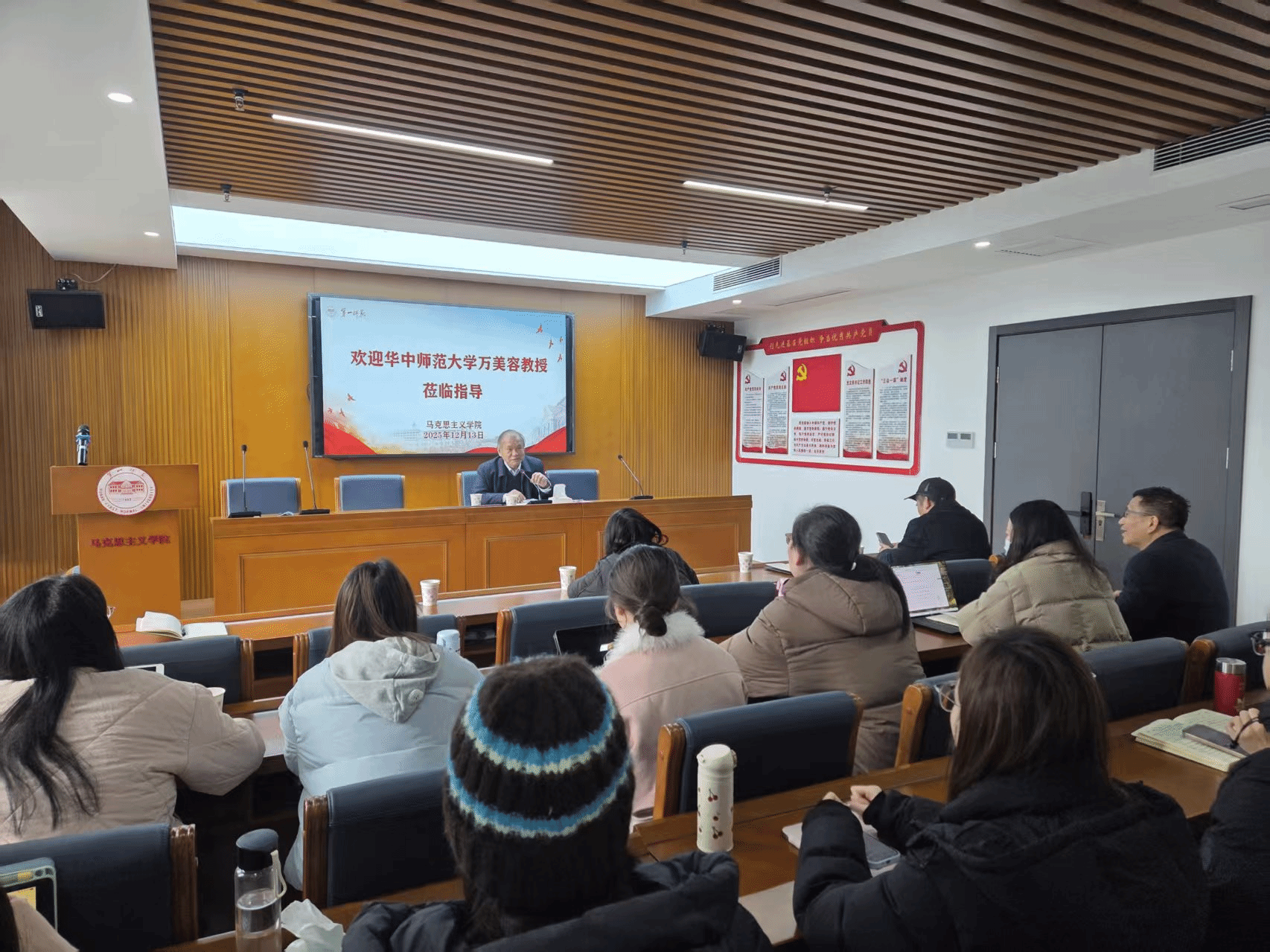 为深入推进马克思主义理论学科建设,进一步提升硕士研究生培养质量,12月13日上午,学院特邀国务院学位委员会学科评议组成员、华中师范大学伟德国际victor1946原院长、博士生导师万美容教授来院,就学科建设与高级别项目申报工作进行指导交流。座谈会由院长陈明教授主持,副院长王竹苗、二级教授贺汉魂、数学与统计学院党委书记阮东彪以及研究生代表共40余人参加。