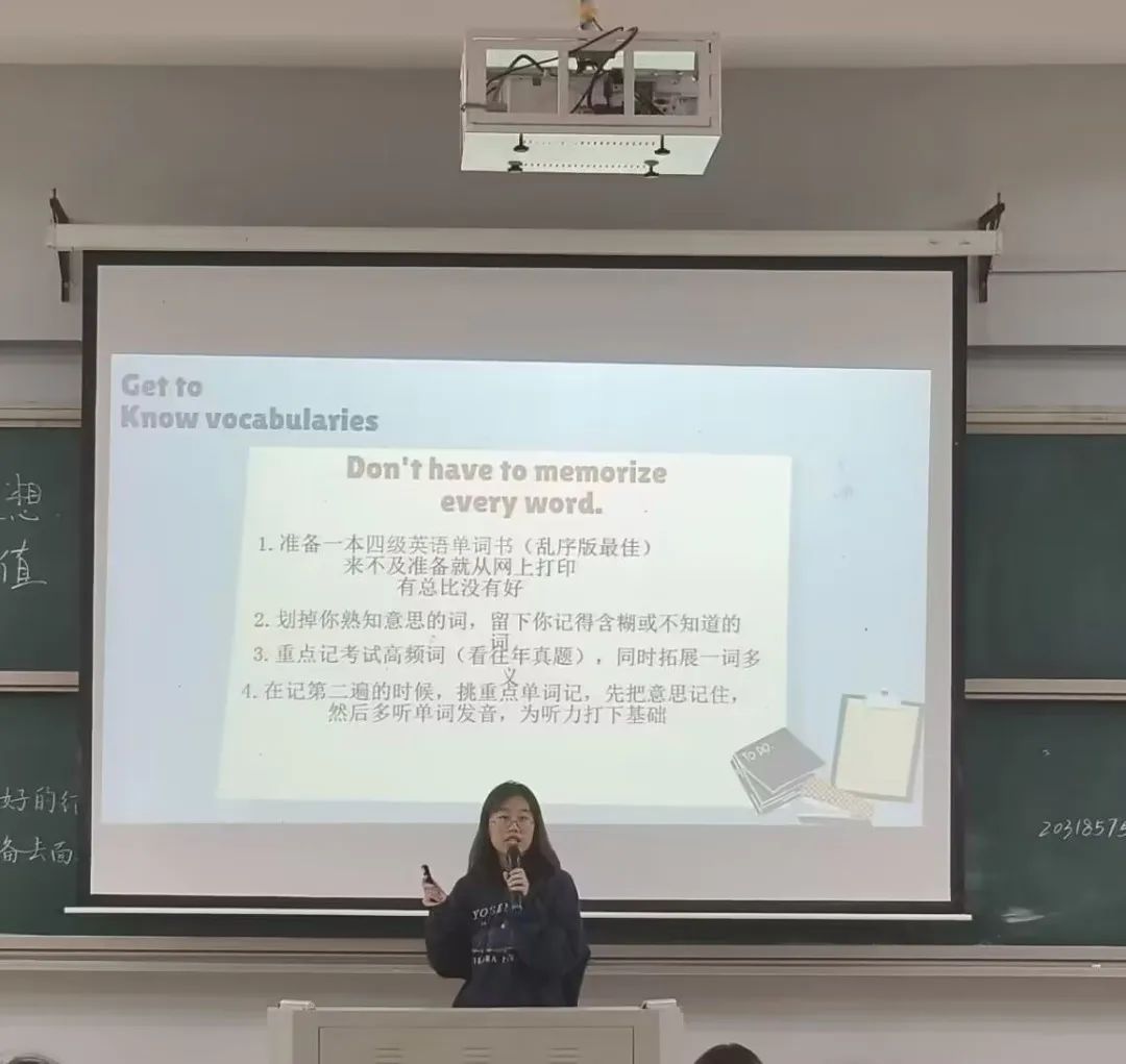 最后,我院四级考试优秀代表蔡雯萱同学、喻雨妍同学为大家倾情分享了自己的高分备考方法,就阅读、听力等方面提供了关键性的得分技巧,为即将考试的同学们送来宝贵经验。