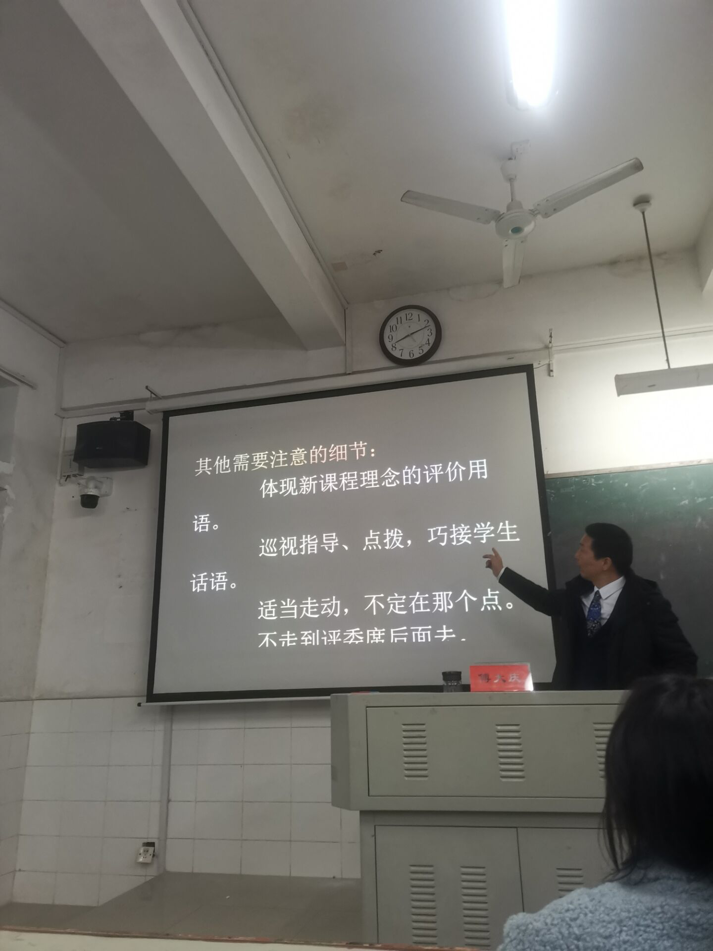 傅大庆校长首先就教师教案书写进行一定讲解,关于学习、教学的目标,傅大庆校长从定向—指引师生教与学,控制—教学程序的有效进行,协调—知识与能力双向发展,效率—减负减轻盲目训练,竞争—科学评价管理,稳定—提升质量等方面进行了讲述,并强调,在目标描写时,必须具备四个要素,即:主体、条件、动词、程度,并做了相关举例。