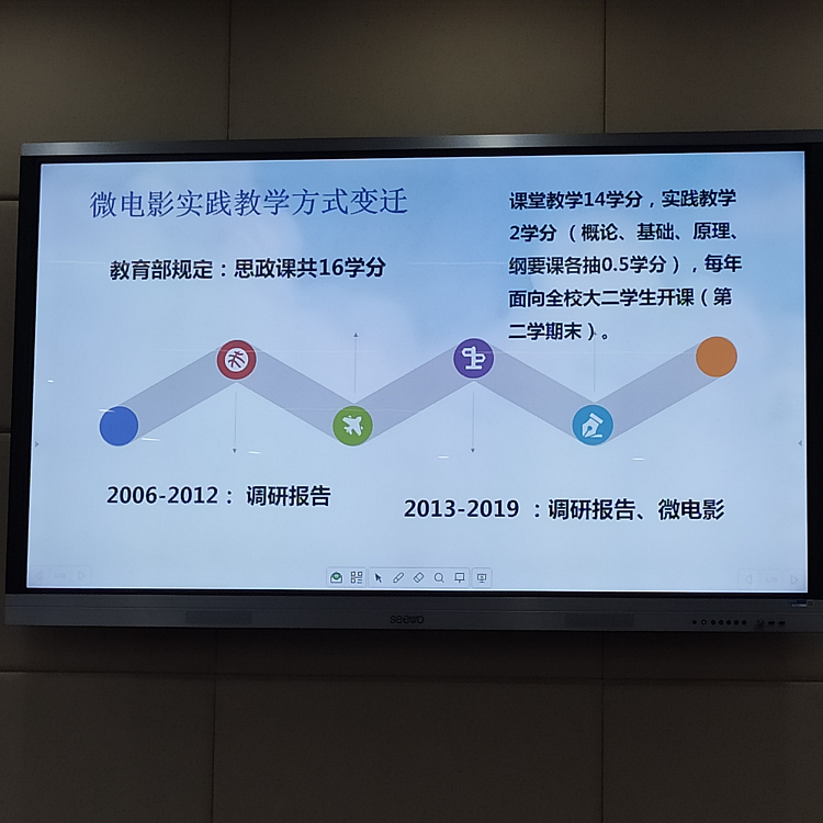 柴素芳教授以有奖竞答的方式拉开了讲座的序幕。本次讲座以“思政微电影构思与制作”为主线,分为五个部分进行讲解。一、提出“幸福由微电影打开”的理念,让思政课实践教学插上微电影的艺术翅膀;二、提出让学生以微电影的形式展示自己的学习报告,实践教学新方式;三、坚守初心确立改革定位,历经七年艰辛探索形成11349特色,一部影片点燃星星之火;四、“进”形成改革体系,四项要求确保改革质量,九多特色见证改革成果。她指出制作微电影一定要会推动故事情节,可通过旁白、人物前后的变化、刻画细节等方式推动故事情节;五、全面推进改革成果,4400部微电影已形成星火燎原之势。讲解期间向大家展示了自拍自导自演的河北大学思政教学阶段性成果——《幸福阳光》,此微电影是将幸福观融入思政教学的典范。她认为,教学需要创作的艺术,而将以微时长、微制作、微投资为显著优势和特点的微电影引入思政教学是对创作艺术的最美阐释。