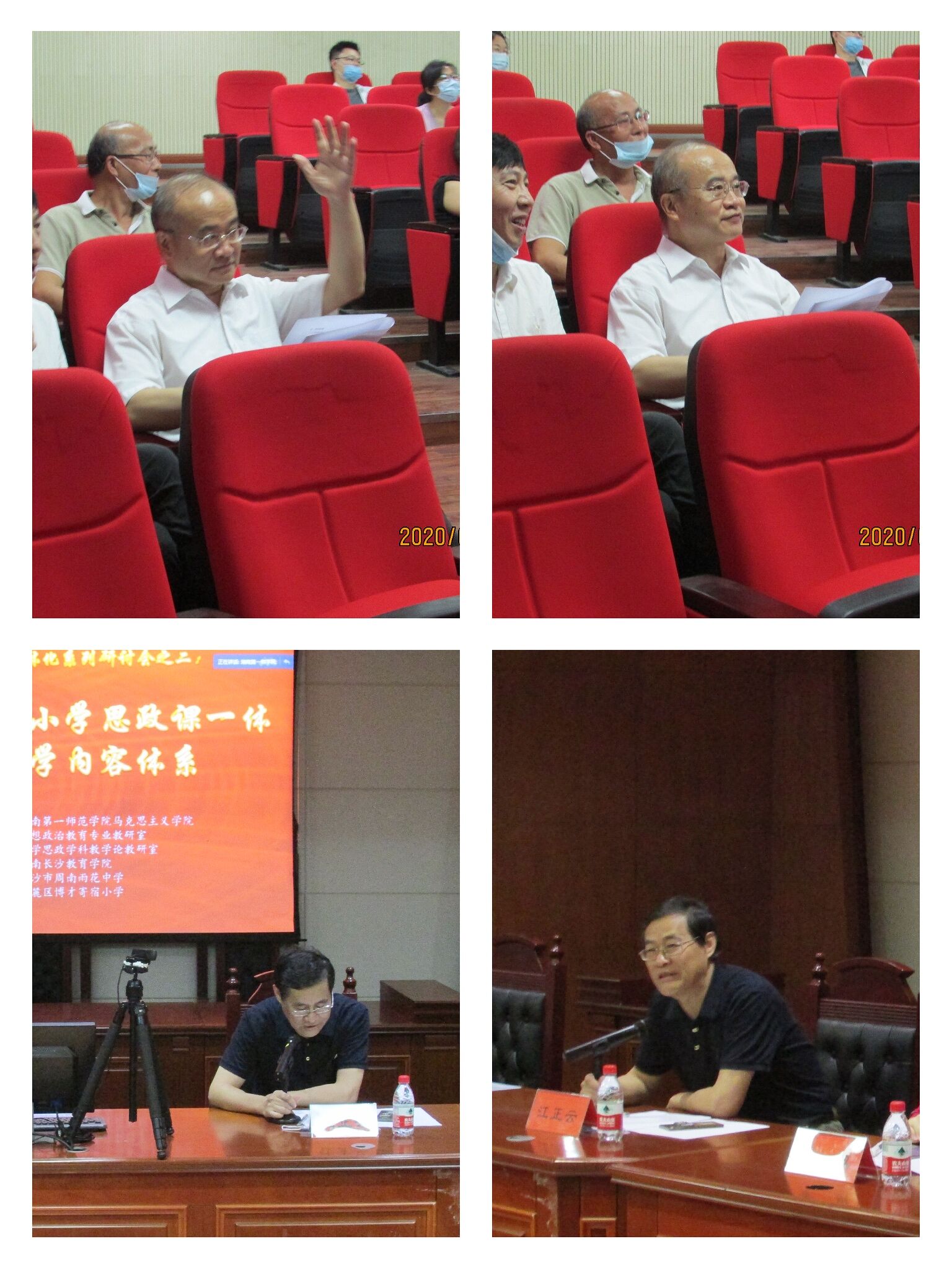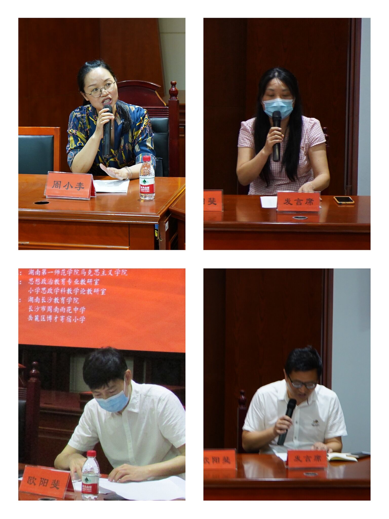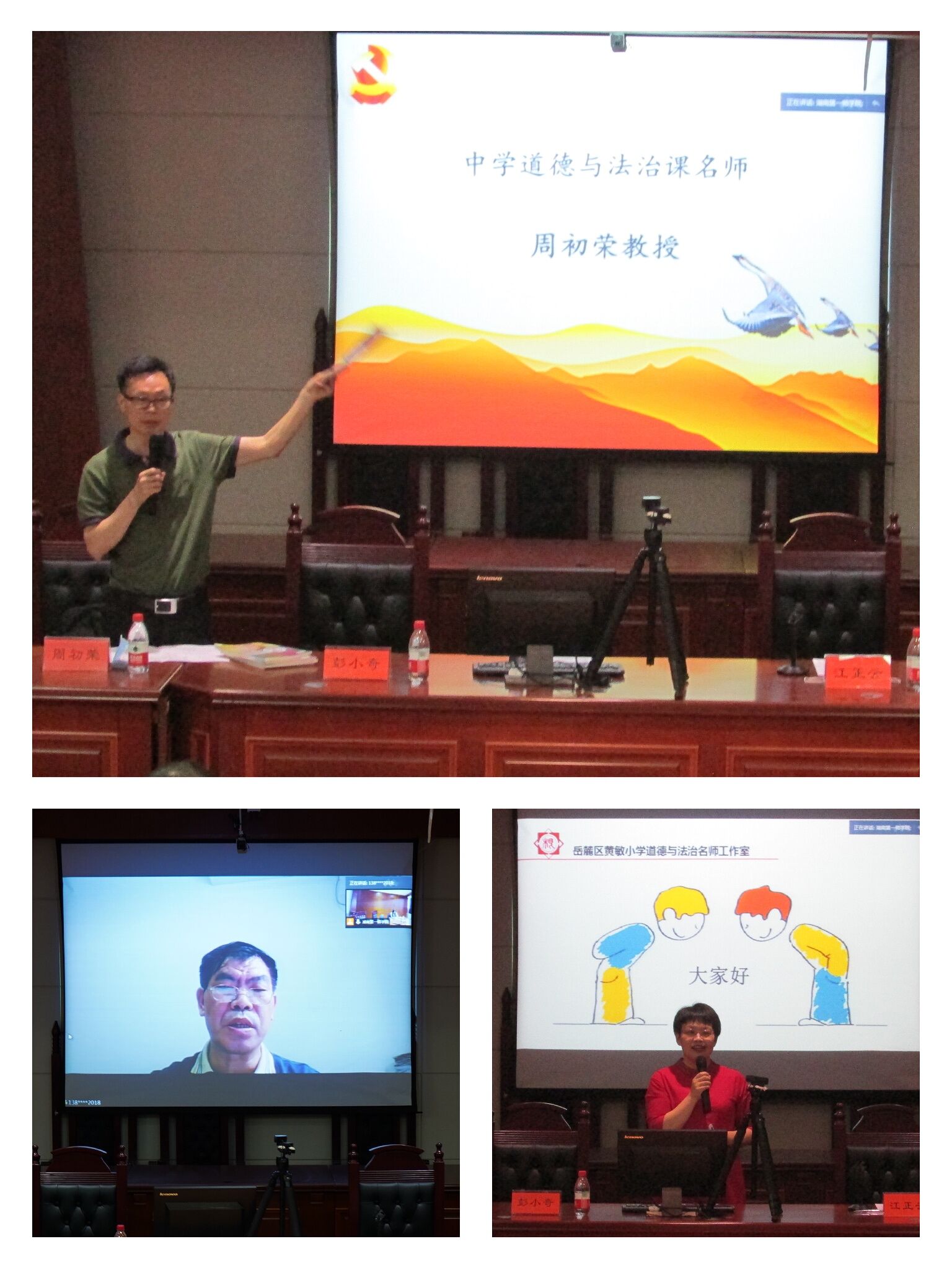 研讨会的三位特邀嘉宾作了精彩的演讲。博才寄宿小学黄敏老师从一条主线、六大生活领域、七大教育主题等方面介绍了小学道德与法治课程设计和教材编写的基本思路;周南雨花中学周初荣老师分析了初中学段道德与法治课程的主要教学内容、教学方法以及学情,强调指出了初中道德与法治教师应当具备的综合素养;长沙教育学院唐良平教授通过线上讲座方式深度解读了新课改对高中思想政治学科在课程板块、教学内容等方面所带来的一系列变化。