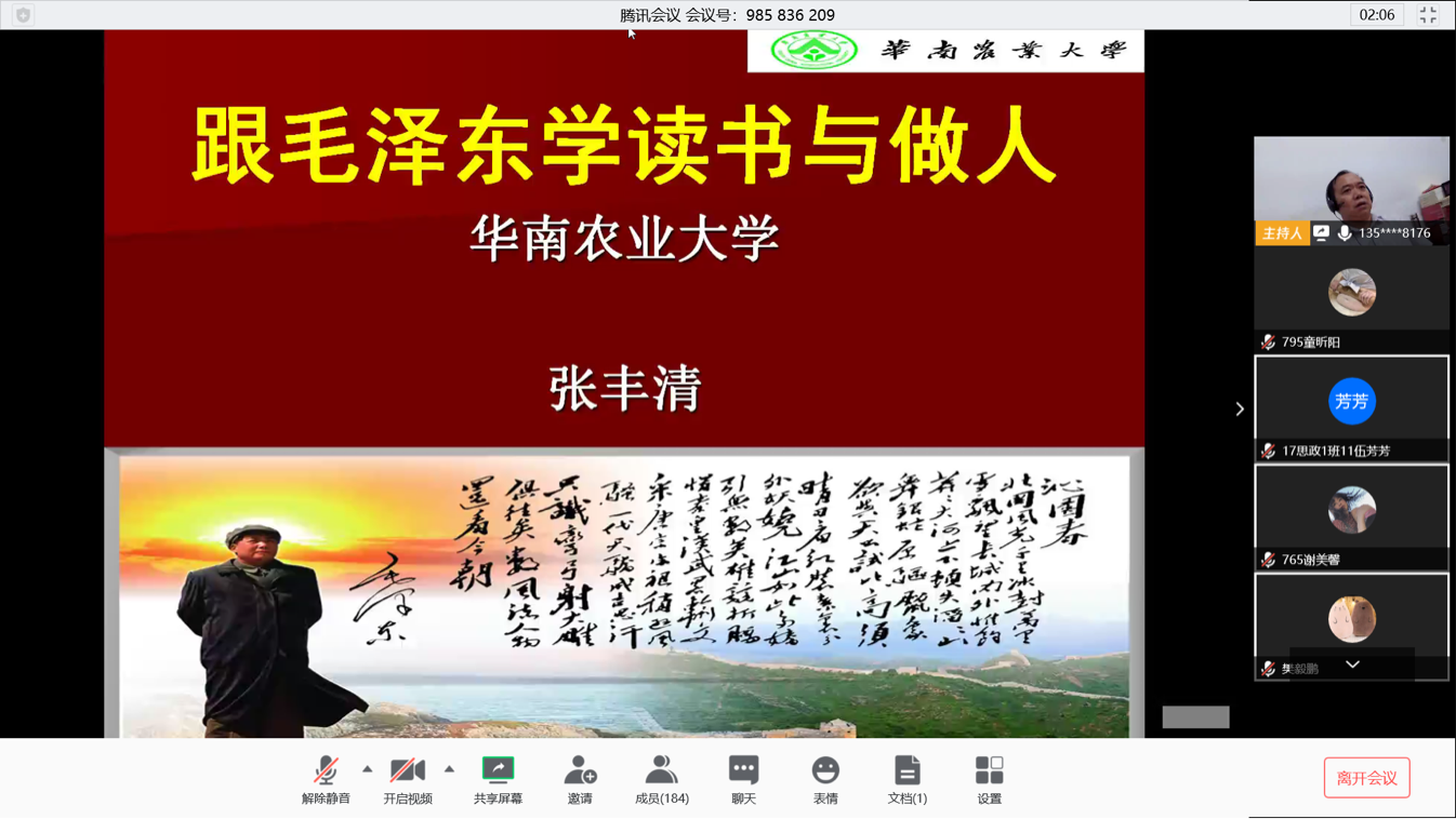本报讯(通讯员谢素科黄毅敏)我校具有光荣的革命传统,是毛泽东思想的萌芽地和马克思主义中国化的发源地之一。一代伟人毛泽东在此求学、工作八个春秋,并在此从事中国共产党的创建等一系列革命活动,一师学子始终坚持红色基因弘扬,矢志不渝地对毛泽东精神进行深入的研究、学习。2020年6月14号晚7时,由伟德国际victor1946主办,张丰清教授主讲的《跟毛泽东学读书与做人》线上专题讲座正式开讲。周小李院长、谢素科副书记出席本次讲座。本次讲座由周小李院长主持。