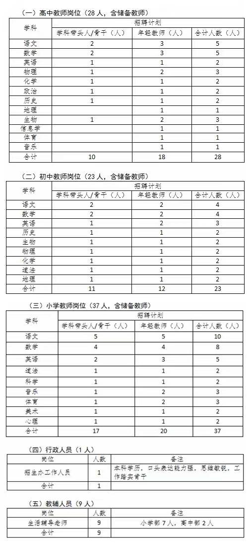 优秀教师和行政岗位招聘计划
