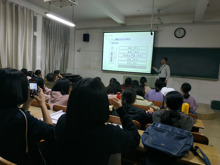 11月17日上午八点半,我院诚邀长沙市周南雨花中学的周初荣老师在怀中南404拉开了初级中学思想品德教师资格证面试策略讲座的帷幕。
