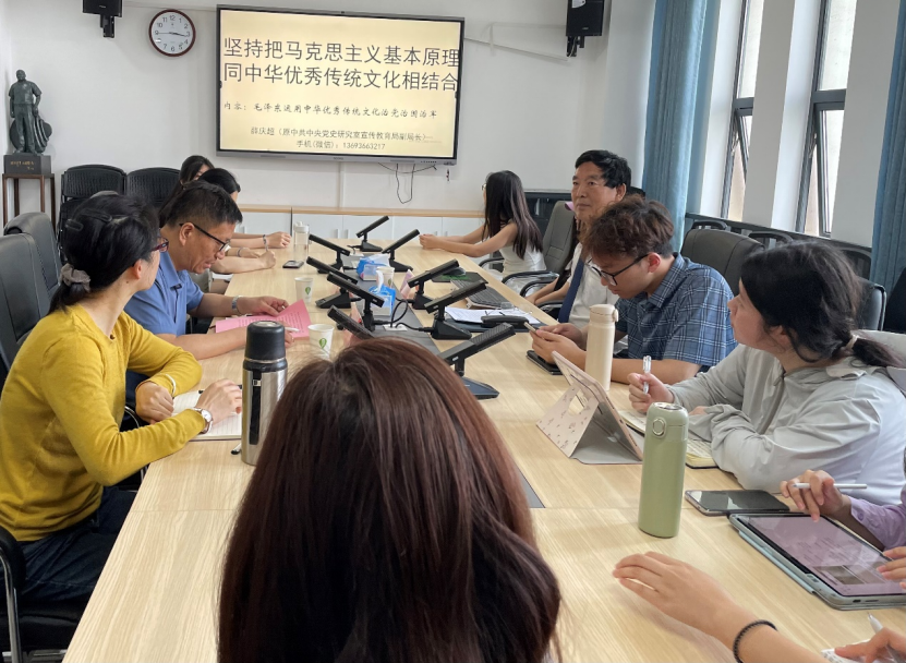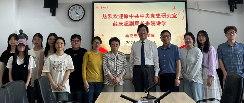 2024年5月15日下午,中共中央党史文献研究院研究员、原中共中央党史研究室宣传教育局副局长薛庆超莅临我院讲学,讲学主题是“坚持把马克思主义基本原理同中华优秀传统文化相结合:毛泽东运用中华优秀传统文化治党治国治军”。报告会在百熙楼1010会议室举行,讲座由我院党委书记阮东彪主持。我校党委委员、纪委书记李昱、我院副院长胡慧娥和吴红老师等教师、研究生、本科生代表聆听了讲座,出席了报告会。