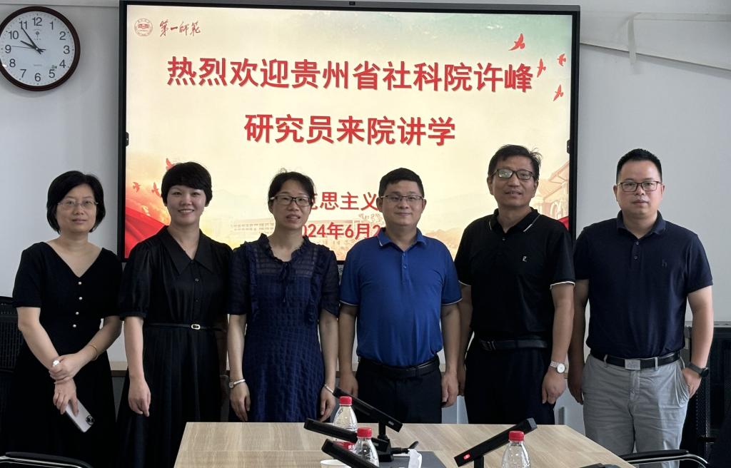 2024年6月21日上午,贵州省社会科学院马克思主义研究所所长许峰研究员应邀来院讲学,讲学主题是“一篇优秀咨政报告是怎样炼成的?”报告会在百熙楼1010会议室举行,由我院党委书记阮东彪主持。科研处罗燕副处长、我院副院长胡慧娥、习近平新时代中国特色社会主义思想概论课教研室主任陈辉吾、形势与政策课教研室主任宋徽瑾以及部分学生参加了讲座。