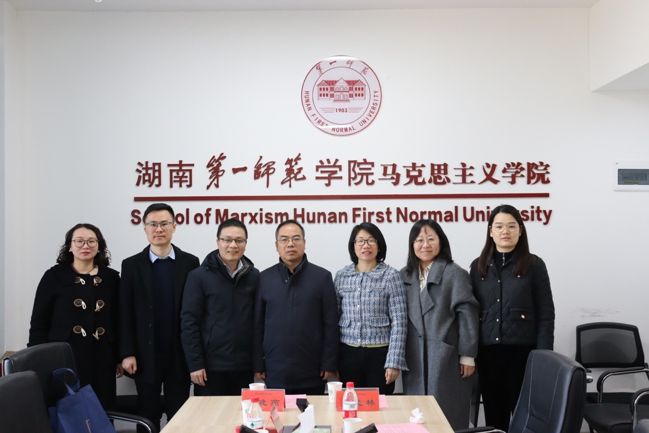 胡慧娥简要介绍了我校及院部基本情况,汇报了今年3月18日习近平总书记考察我校时的情形,总书记殷殷嘱托大思政要抓好,红色资源要用好,第一师范要办好。为深入贯彻落实习近平总书记重要讲话精神,学校出台系列政策文件,加强贯彻落实习近平新时代中国特色社会主义思想体制机制建设,着力推动思政课和课程思政改革,在馆课一体化实践教学模式创新、讲好习近平总书记“湖南足迹”系列故事思政课方面作了深入探索。贺新元介绍了中国社会科学院马克思主义研究院的基本情况,就我校红色资源挖掘利用并有效融入思政课教学,贯彻落实习近平新时代中国特色社会主义思想的路径方法进行了针对性指导。随行调研人员在交流中亦纷纷建言献策,认为我们作为毛主席母校,要把自身特色优势充分彰显,将日常思想政治教育落到实处,思政课教学既要发挥集体备课的智慧,也要体现教师个人风格,要将团队优势与教师独特优势有机整合。