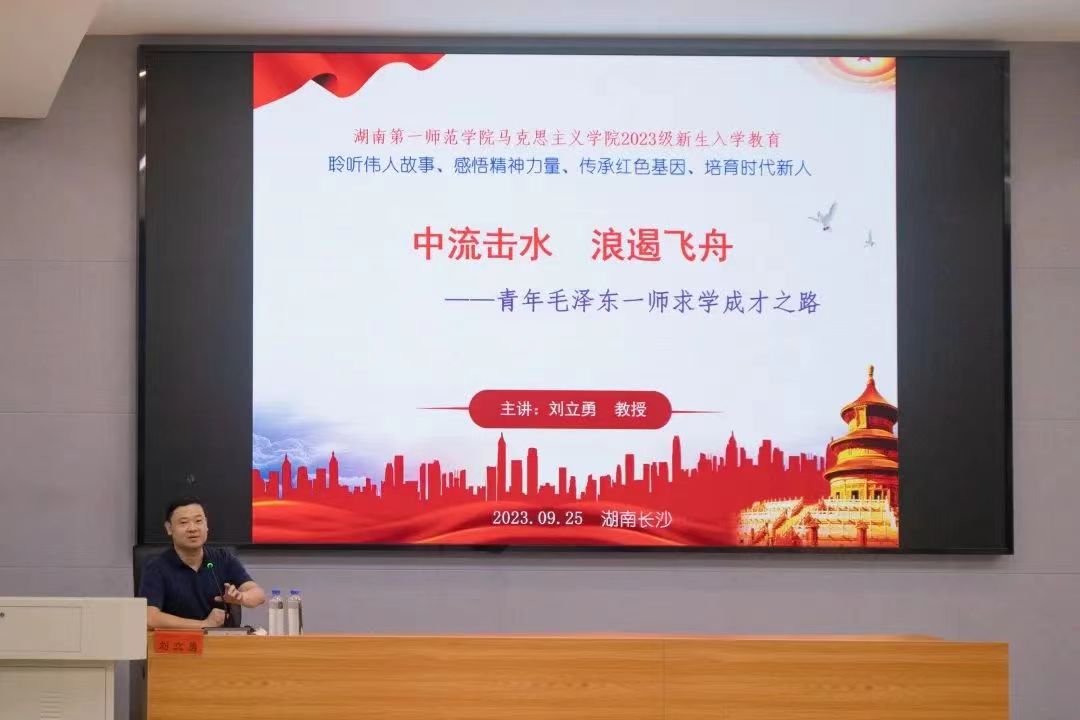 9月25日晚,我院特色活动“思行先锋”论坛讲座暨2023级新生入学教育活动于玉衡南101教室顺利举行,此次讲座特邀学校计算机学院党委书记刘立勇教授主讲,讲座主题为《中流击水 浪遏飞舟——青年毛泽东一师求学成才之路》,学院党委副书记胡英、学工办主任于澎、分团委书记刘艳霓以及全体23级新生参加了此次精彩讲座。