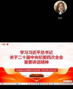为深刻领会习近平总书记在二十届中央纪委四次全会上讲话的重大意义、精神实质和丰富内涵,准确把握全会提出的新论断、新部署、新要求,以全面从严治党新成效为推进学生支部高质量发展蓄势赋能,2025年1月14日,伟德国际victor1946学生党支部采用线上集中学习的方式组织全体党员及预备党员开展题为“学习习近平总书记关于二十届中央纪委四次全会的重要讲话精神”的主题党课活动,本次党课由学生党支部书记刘艳霓主讲。