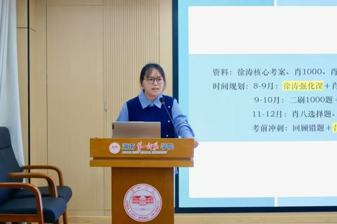 在经验分享环节,四位优秀考研学生代表依次上台。张佳清同学分享了报考湖南大学学科思政专业的经验,强调要根据自身情况选择适合的备考方法,做到有的放矢;胡沁彤同学详细介绍了报考湖南师范大学学科思政专业的学习方法,为同学们提供了实用的备考建议;喻雨妍同学以416分的优异成绩考入南京师范大学,她重点分享了英语学习的技巧与心得,强调了坚持和积累的重要性;罗姝畅同学则以两门专业课140分以上的优异成绩成功考入中国青年政治学院,她着重讲解了专业课的学习方法和备考策略,为同学们指明了方向。