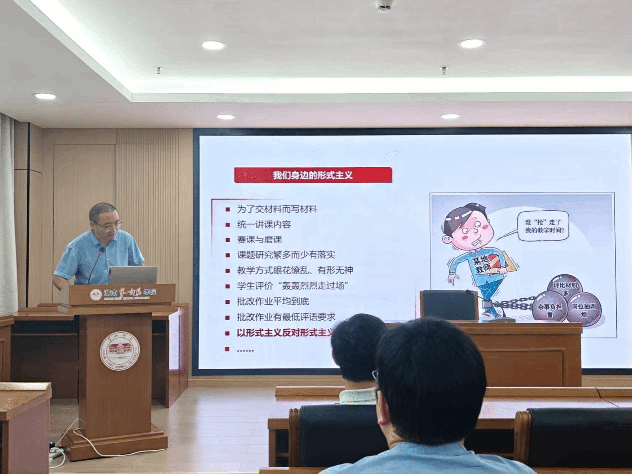 党支部书记吴承富以《坚决反对形式主义》为题,直击痛点,发人深省。他结合基层工作实际,列举了工作中可能存在的过度留痕、重复报表、会议冗长等形式主义表现及其对教师精力、教学创新的严重消耗。吴承富强调,反对形式主义绝非空喊口号,必须拿出刮骨疗毒的勇气和务实管用的举措。他要求支部全体党员从自身做起,从每一次会议、每一份材料抓起,大力倡导“短实新”的文风会风,坚决破除束缚教师手脚、影响育人实效的形式主义枷锁,让教师能将宝贵精力真正回归课堂、回归学生。