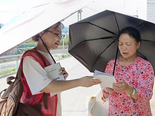 7月17日晚,宣讲团成员从黄材镇中心小学出发,徒步前往当地标志性建筑——黄材水库,以自制的理论普及手册和折页等为宣讲核心材料,沿途向当地村民宣讲党的路线、方针、政策,普及“民法典”、“养老防诈骗”相关知识。为进一步扩大活动影响力,团队成员在“一师马院”抖音号对宣讲过程进行同步直播,在扩大本次理论普及宣讲活动受众面的同时,带领广大网友共同欣赏黄材镇的秀丽风光。