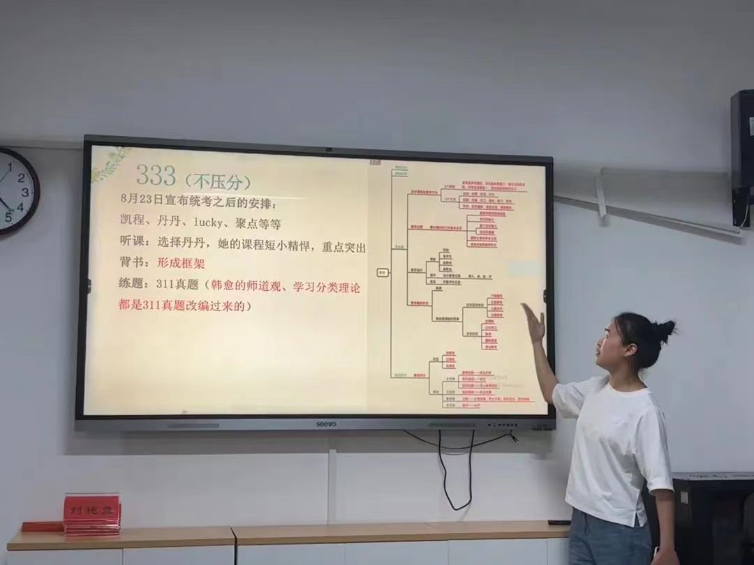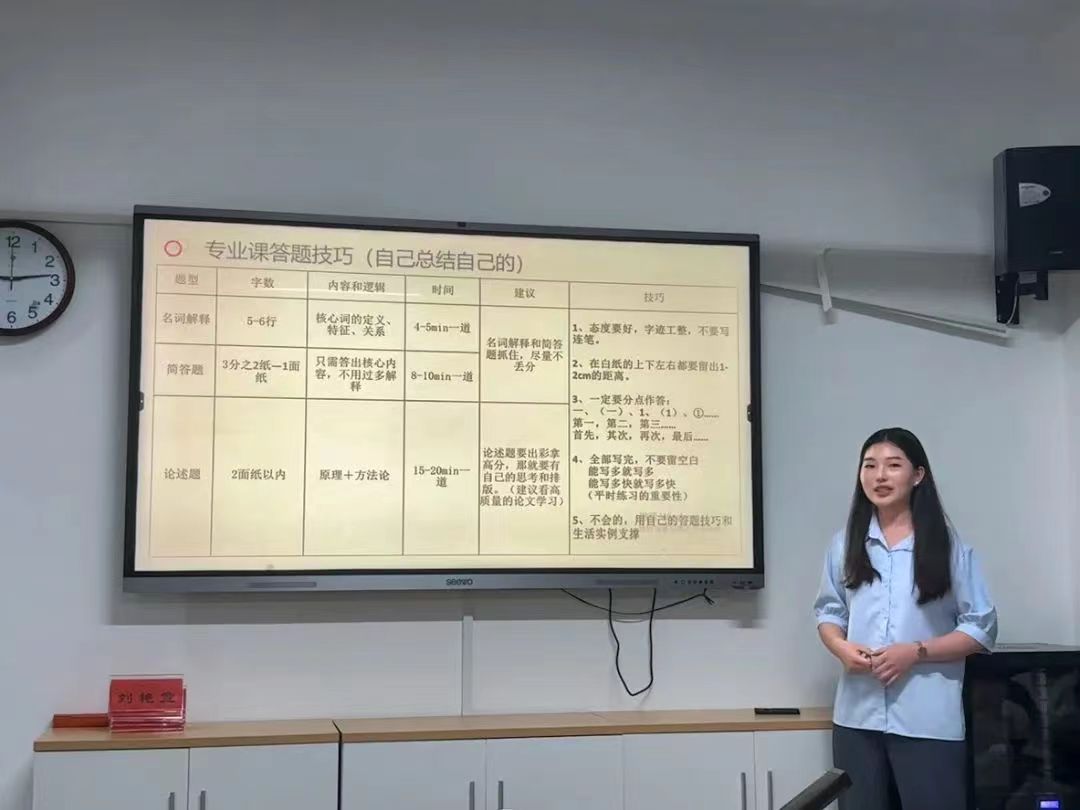 随后,由成功上岸的学姐们围绕目标选择、学习方法和心态调整等方面依次进行经验分享。在学习方法上,金珊、蔡雯萱特别强调要注重把握思维导图的运用,建议考生们找到适合自己的备考方法,全盘分析自身存在优点与不足,在保持优势的同时补齐短板。针对英语科目学习,胡友唯、李文竞分享了自己的方法,那就是一定要注重单词的积累和真题的学习,在整个备战的过程中要坚持培养语感,不断夯实英语学习的基础。