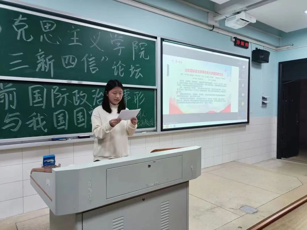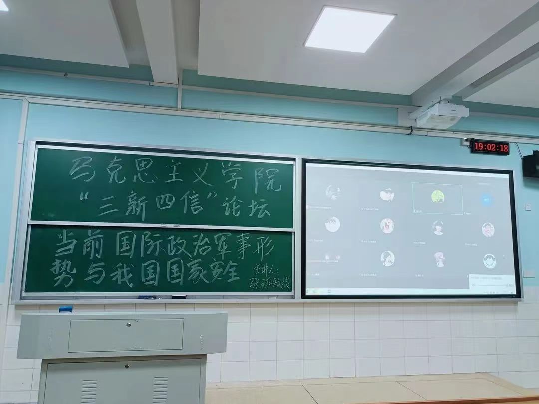 我院特色活动三新四信论坛于11月18日晚七点在怀中南105顺利开展。本次讲座主讲人为我院军事学博士张元伟教授,主题是“当前国际政治军事形势与我国国家安全”。我院党委书记阮东彪、副书记胡英、学工办副主任刘艳霓以及21思政1班、22级895、896班的同学以线上和线下相结合的方式参加了本次精彩的讲座。