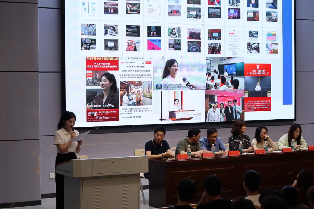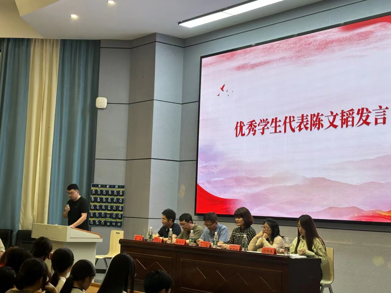 随后,陈潇潇、杨荣、张雨轩和陈文滔四位同学作为获奖学生代表发言,分享他们的学习经验和成长心得。陈潇潇是湖南省优秀毕业生,曾获得国家奖学金、马云卓越师范生奖,她从个人成长经历出发娓娓道来,在大学生涯规划、学习与工作的平衡等方面给出了十分中肯的建议。杨荣作为国家奖学金获得者,她结合个人实际情况,从学习心得、科研竞赛和工作实践三个方面展开介绍,鼓励同学们积极投身于学院工作,在服务学院、服务同学的同时学习知识、练就本领、提升能力。国家励志奖学金获得者张雨轩则从学习方法、参赛经验和个人感悟三个方面进行分享,着重介绍了积极参与学科竞赛的重要性,鼓励同学们以赛促学、提升专业素养。陈文滔是学院青志协负责人,作为优秀青年志愿者,他主要分享了自己在青志协的工作开展、工作成绩和经验总结等情况。四位优秀学生代表的发言深深感染了在场的每一位师生,引发了广泛的共鸣。