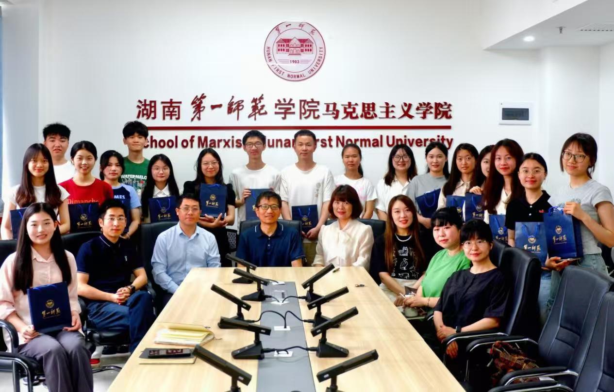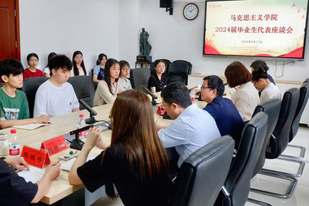 会议伊始,院长陈明首先深情回顾了一师的发展历史,他感慨地说:“一师马院见证了无数青年学子的成长与蜕变,也承载着我们的光荣与梦想。”随后,陈院长向即将离开母校的毕业生们送上了诚挚的祝福:“祝愿你们前程似锦,工作顺利,人生圆满幸福。”他鼓励毕业生们要铭记第一师范的教育和荣光,以坚定的意志和务实的态度,做好每一份工作,用长远的眼光看待人生。随后,毕业生代表依次发言,从不同的角度分享他们在学习、实践、活动以及个人成长等方面的经历与感悟。蔡雯萱是湖南省优秀毕业生,已成功上岸湖南大学硕士研究生,她格外感谢学院的栽培,尤其是学院领导老师在考研管理服务方面给予的引导、支持和关怀。转专业来马院求学的胡友唯表示“完全不后悔当初的决定”,她在学院老师的帮助和鼓励下,脚踏实地、刻苦钻研,成功上岸华中师范大学硕士研究生,未来她将不忘初心去到祖国最需要的地方,去创造并实现自己的人生价值。紧接着,领导老师们纷纷表达了对毕业生的嘱托和祝福。胡英书记细数与同学们相处的点滴回忆,她表示:“你们既是一师马院成长发展的见证者,也是建设者和参与者,对此我深感骄傲和欣慰。”对于考研深造的学生,她期望学子们能永葆初心,在学术研究的道路上继续勇攀高峰;对于即将步入社会的学生,则希望他们时刻牢记校训精神,为教育事业添砖加瓦。王竹苗院长则提出了三点期盼:一是要传承第一师范的优良传统,学会欣赏和尊重他人;二是要追求卓越,以更高的标准要求自己,为未来的成就奠定坚实基础;三是要劳逸结合,关注身心健康,保持积极向上的心态。谢玮老师、刘艳霓老师和熊敏秀老师也一一表达了对毕业生们的真挚祝福和殷切期望,鼓励同学们要有不畏困难的勇气,勇敢面对末来的挑战。最后,由阮东彪书记对本次座谈会进行总结发言。阮书记向毕业生表示祝贺,嘱托大家要牢记“要做人民的先生,先做人民的学生”的校训,秉承“实事求是”的校风,将马克思主义的精髓内化于心。他强调,同学们要深入学习贯彻习近平总书记重要讲话精神,立报国强国大志向;要坚持终生学习,不断拓展人生发展空间。阮书记表示同学们传达的真情和建设性的意见学院都已收到,欢迎同学们常回家看看。