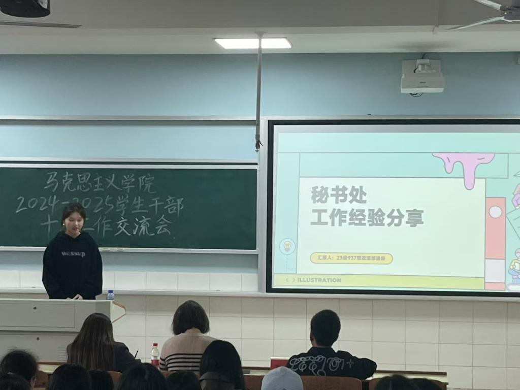 交流会伊始,与会人员齐唱团歌,随后秘书处负责人邹涵靓、团委办公室负责人胡卓尔和学生党务工作办公室负责人梁承鸿先后上台分享工作经验。邹涵靓同学从信息收集工作、素质能力分管理、值班表安排、德育考核四个方面详细介绍了秘书处的日常工作以及工作中的所思所想、改革创新。胡卓尔同学则回顾了团委办公室牵头开展的重点工作和她们的工作思路,她以撰写一则活动通知为例,指出通知其实是工作思路的体现,须准确且完整。梁承鸿同学围绕学生党支部如何开展“一月一课一片一实践”活动展开汇报,强调以“创新”凝聚人气、增强实效。