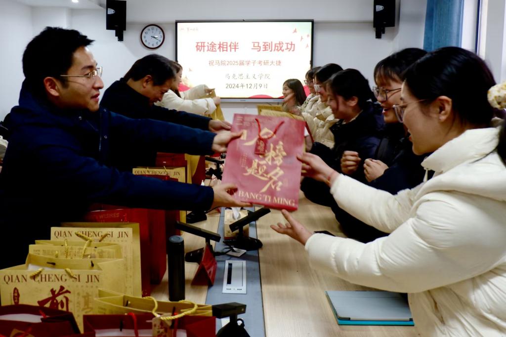 最后,老师们亲手将满载着学院关怀与期望的考研祝福礼包送给了在场的每一位考研学子。胡英书记满怀激情地寄语道:“风好正扬帆,奋进正当时。愿你们带着学院的祝福与期望,在考研的舞台上绽放光芒、斩获佳绩!”