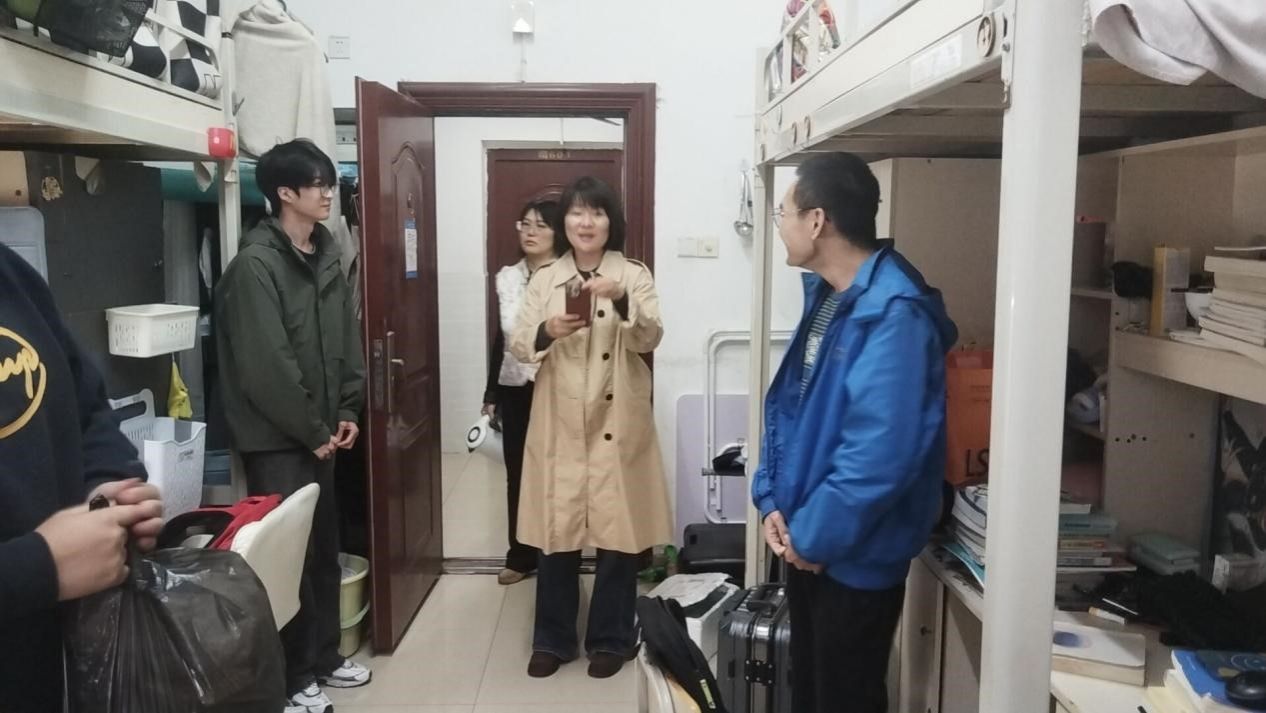 10月23日上午,伟德国际victor1946党委书记曾玉华、党委副书记胡英与辅导员高爱枝一行,走进男生寝室开展实地视察工作。领导老师们细致检查了寝室卫生状况,重点关注内务整理、环境整洁度等细节,对整洁规范的寝室给予肯定,同时针对部分需要改进的地方提出具体建议。在与同学们的交流中,老师们亲切询问大家近期的学习进度、课程掌握情况,以及生活中的困难与需求,耐心倾听学子心声,叮嘱大家要保持良好的作息习惯,注重寝室团结,营造安全、整洁、和谐的住宿环境,以饱满的状态投入到学习与生活中。