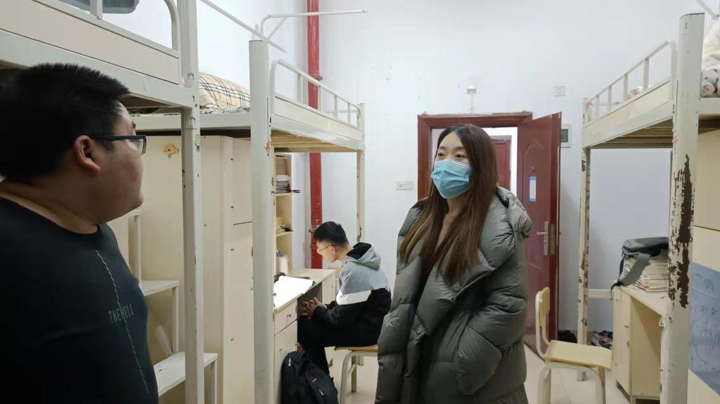 3月21日晚,伟德国际victor1946辅导员刘艳霓走访了女生寝室11栋和男生寝室15、16栋,检查寝室卫生情况,了解学生学习生活情况,督促同学们认真备考四六级,同时了解同学们的心理状况,及时疏导。最后要求同学们严格遵守学校疫情防控政策要求,寝室每天通风,保持整洁,并且要及时做好消杀工作。