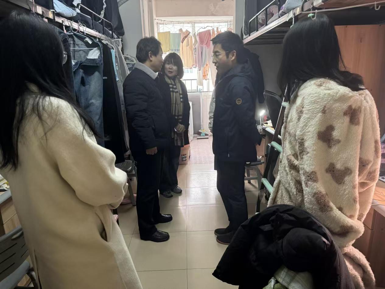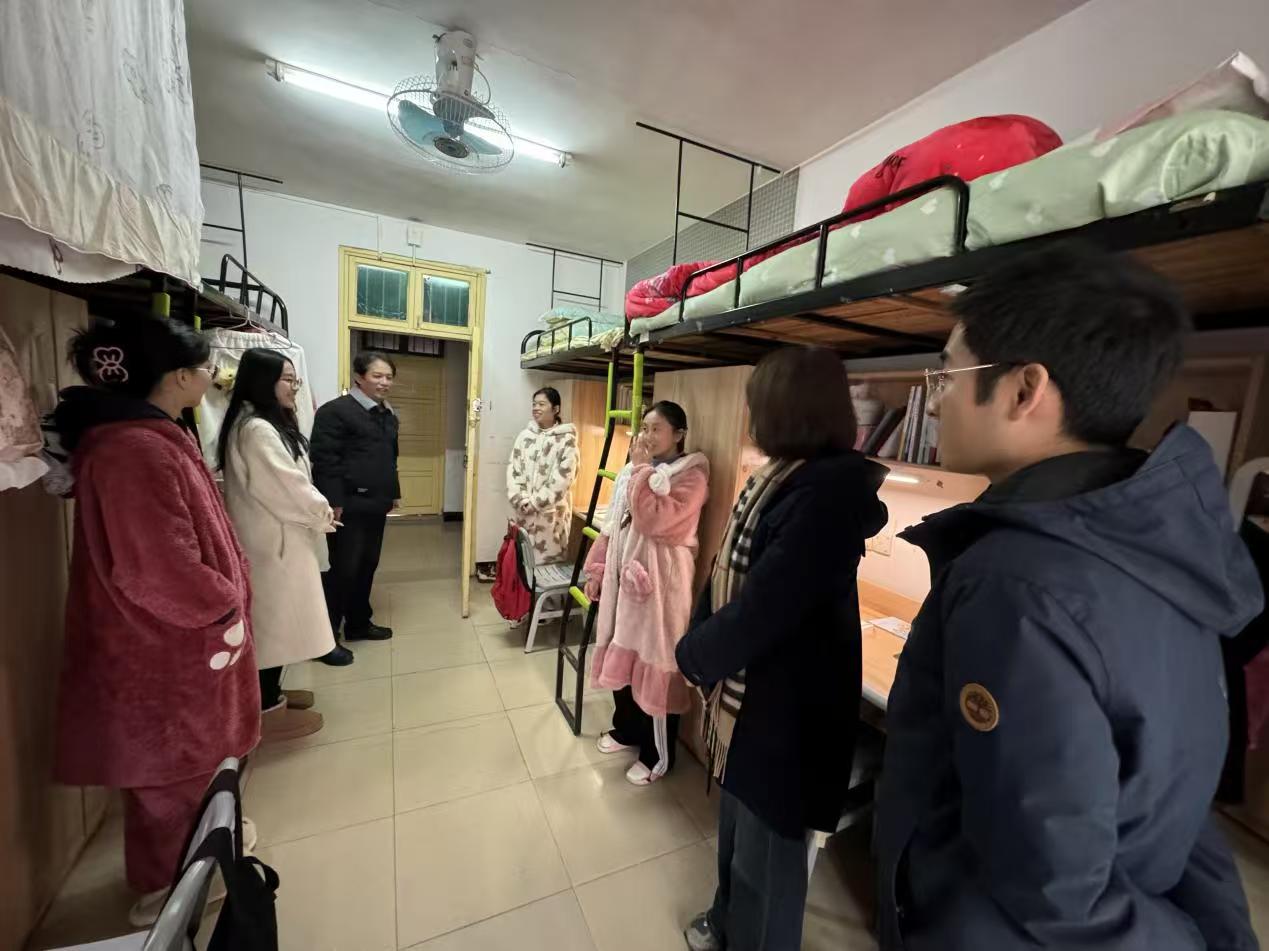 12月27日下午,伟德国际victor1946党委书记曾玉华、党委副书记胡英带领辅导员深入学生寝室,叮嘱同学们期末合理安排复习时间,同时也耐心提醒同学们,冬季要注意防寒保暖,要提高宿舍安全意识。严禁使用违规电器、大功率电器等,告知同学们未使用的插座等电器设备要及时断电。即查即改,避免事故发生,共同维护宿舍的安全与稳定。