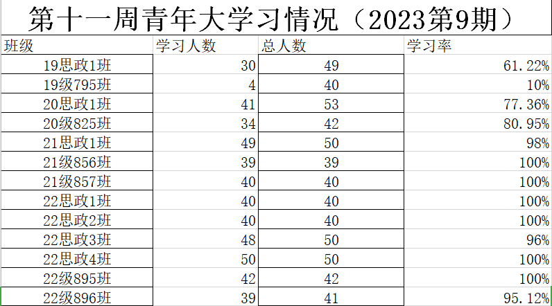 总结: 在本次青年大学习,21级856班、21级857班、22思政1班、22思政2班、22思政4班、22级895班学习率达到了100%,在这里提出表扬;
