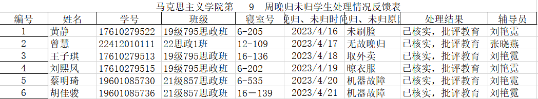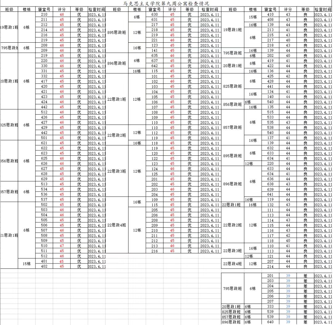 宿舍既是同学们生活,学习,休息的地方,又是学生交流思想,培养综合素质的重要活动场所。为了同学们有个良好的宿舍环境,学校认真严抓的,在此希望每位同学都能认真打扫好寝室卫生,以下就是第九周公寓检查基本情况: