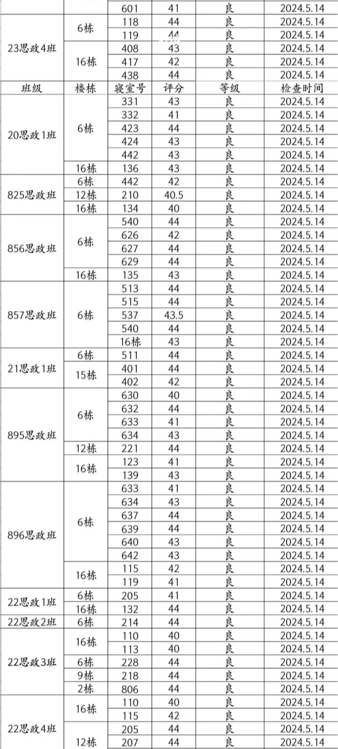 本周大检表现良好,但896思政班6-641(芦艺丹、陈萝玥、谭佳、雷奕林)、22思政4班16-109(朱连涛、胡子曜、李庚鸿、黄天翼)、935思政班6-406(刘瑛、蔡文静、林美平)、936思政班16-618(杨恩旭、刘锦洋、张汗泽、傅灏文)、937思政班16-615(陈国颖、全启航、李书畅、杨程)、23思政1班12-104(龚金沅、丁华娜苏、马孝同、张译予)等宿舍仍需继续努力。希望大家共同努力,建立文明美丽公寓!