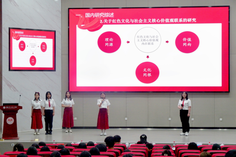 本次比赛面向全校学生,经过初赛和复赛的公平评议,共有11个学习小组进入决赛。决赛分为研究性学习成果展示和答辩环节,参赛小组按照抽签顺序依次进行,由评委进行提问并分别对其表现评分,全面考察选手的临场反应、表达能力和政治素养。比赛中,选手们结合专业优势联系生活实际,用严谨的理论、清晰的思路和艺术性的创新表达,聚焦“大先生、红色文化、中国式现代化、人类命运共同体”等主题,从选题原因、研究综述、研究成果、问题对策、心得体会等五方面进行成果展示。