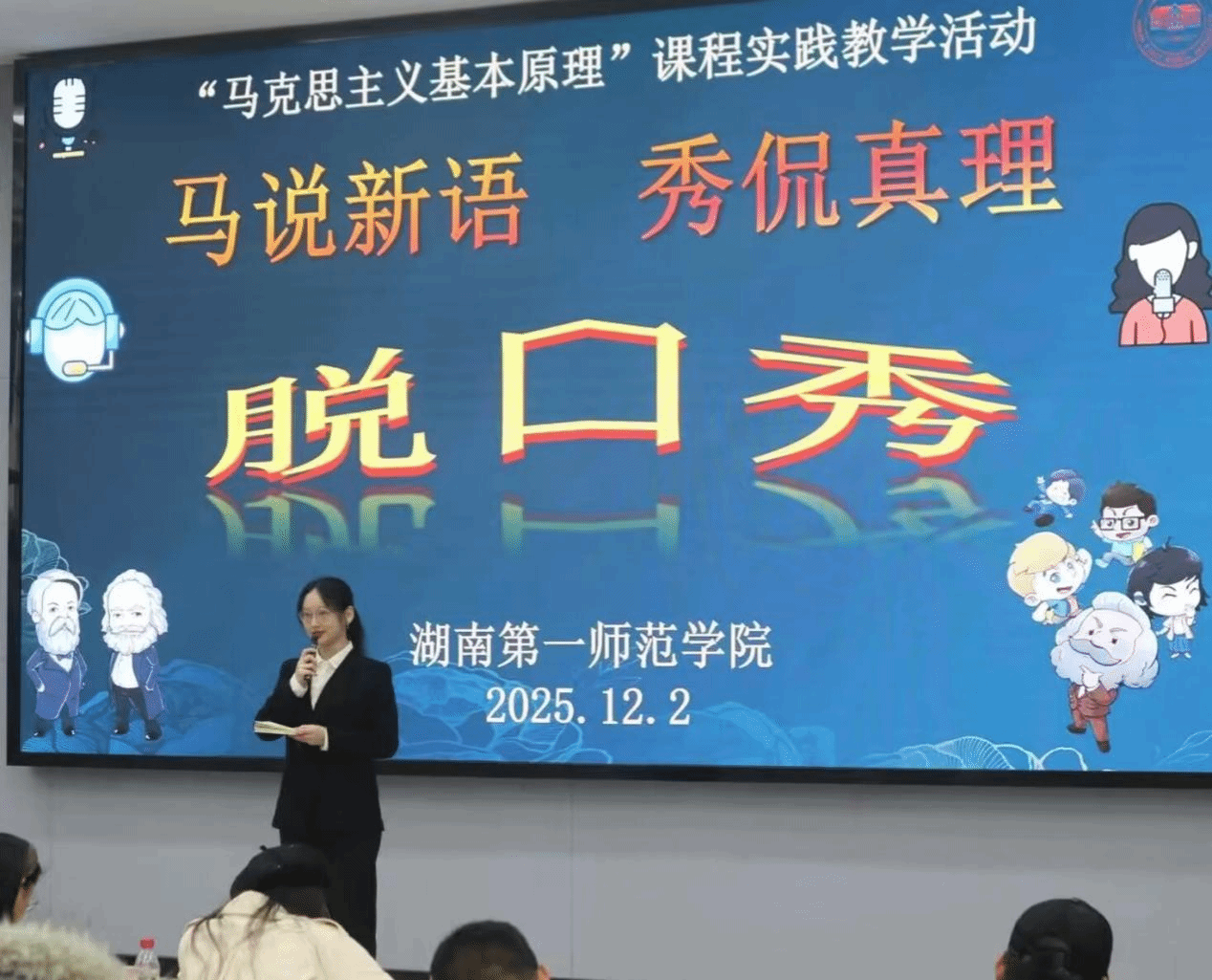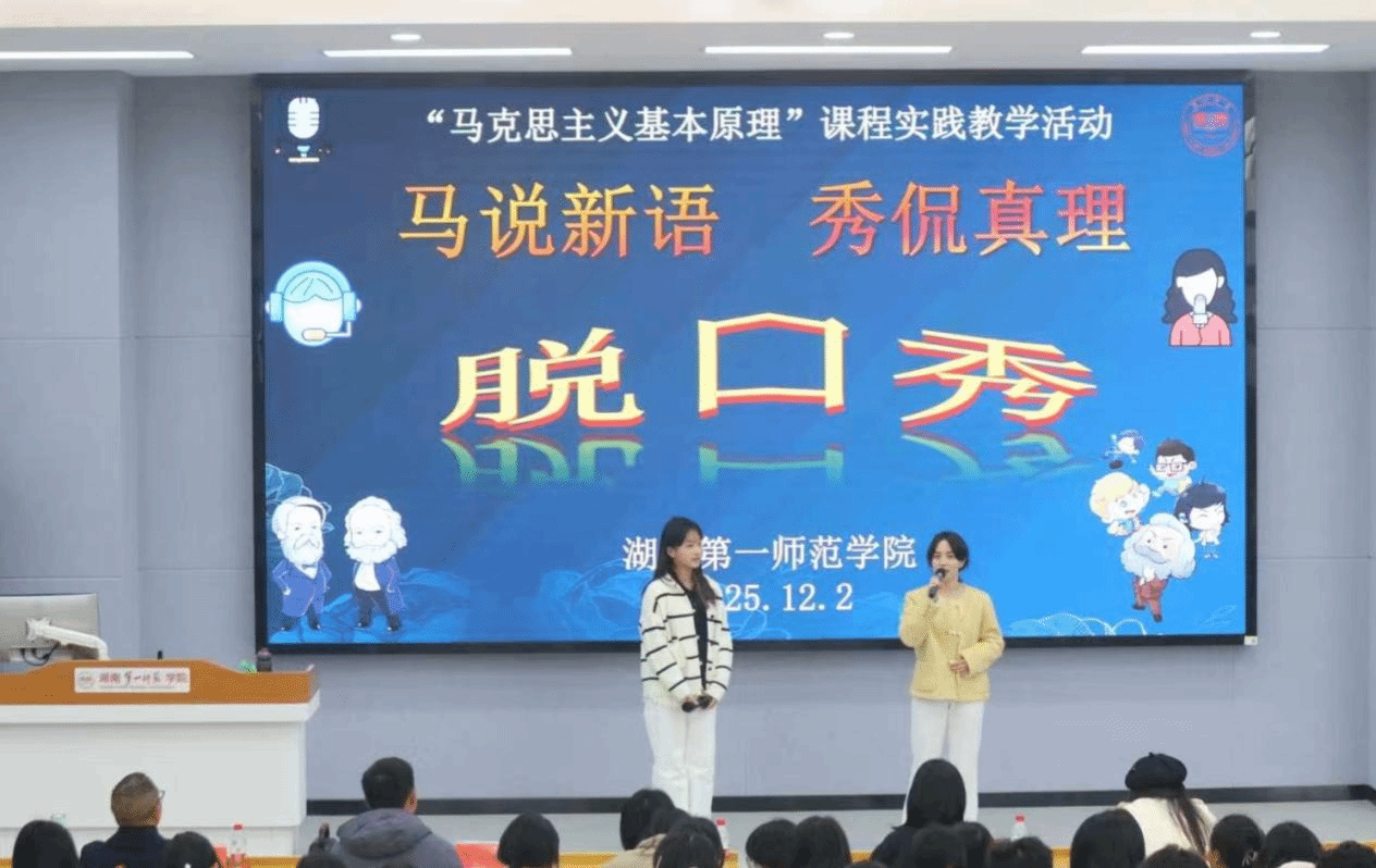 12月2日下午,伟德victor1946润寰楼南栋105报告厅内掌声迭起,以“马说新语 秀侃真理”为主题的脱口秀校级决赛暨《马克思主义基本原理》实践教学展演圆满落幕。湖南大学伟德国际victor1946汪博副教授、湖南师范大学伟德国际victor1946李艳萍博士及本校伟德国际victor1946教学团队担任评委,33组学生作品以青春视角重构理论话语,为思政课实践教学创新提供鲜活范本。