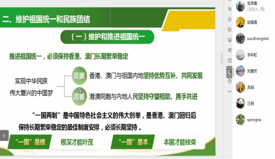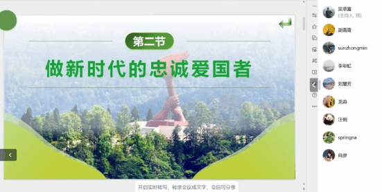 胡青青分享了教材第四专题《继承优良传统  弘扬中国精神》第二节《做新时代的忠诚爱国者》备课成果。胡青青紧贴教材体系,从坚持爱国爱党爱社会主义的统一,坚持维护祖国统一和民族团结,尊重和传承中华民族历史文化,坚持立足中国又面向世界等四个方面,讲述了新时代如何弘扬爱国主义。胡青青老师运用丰富的案例、感人故事,从理论和实践、历史和现实、中国和世界等多个维度,对爱国主义进行了深入的讲解。